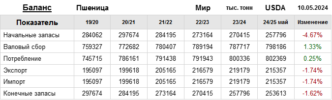За прошедший месяц министерство сельского хозяйства США (USDA) на 10.05.2024 пересмотрело Баланс пшеницы для Мира в сезоне 24/25 следующим образом: