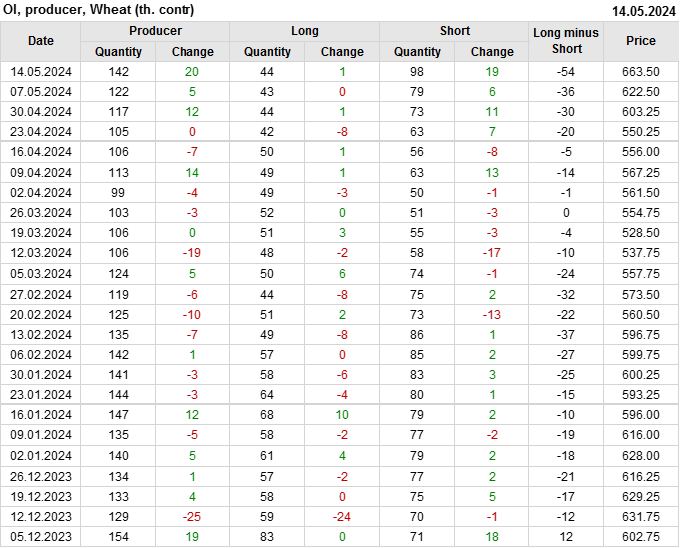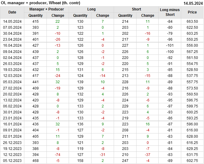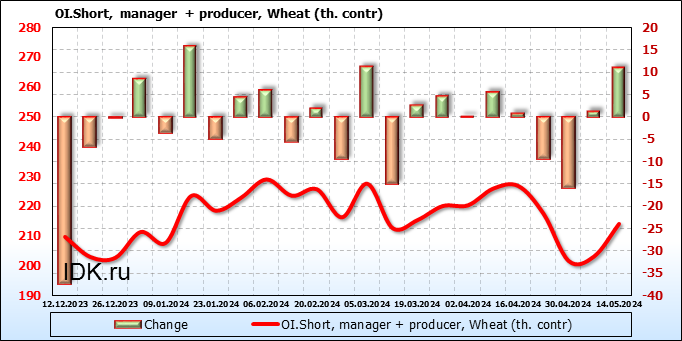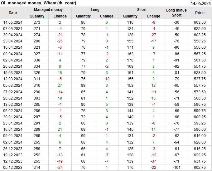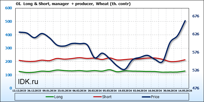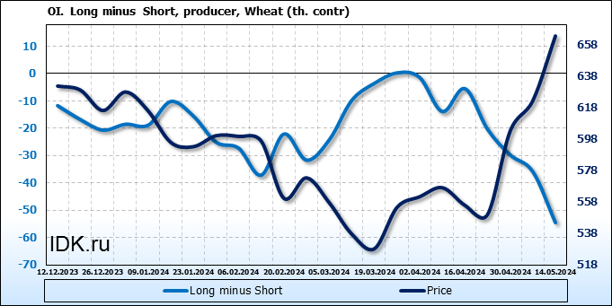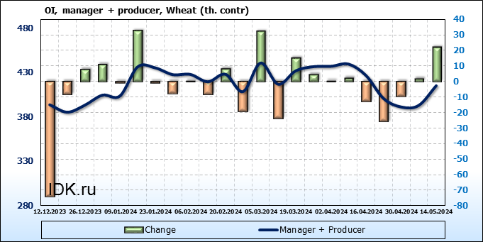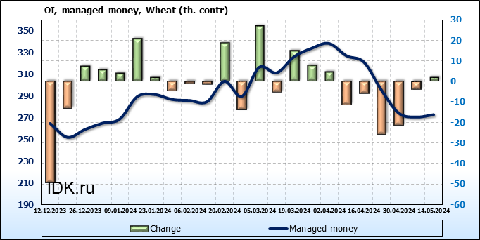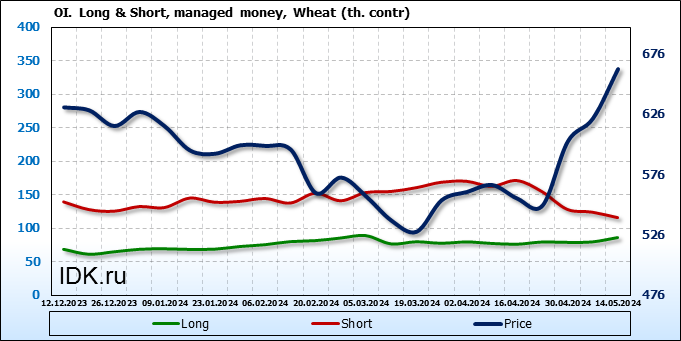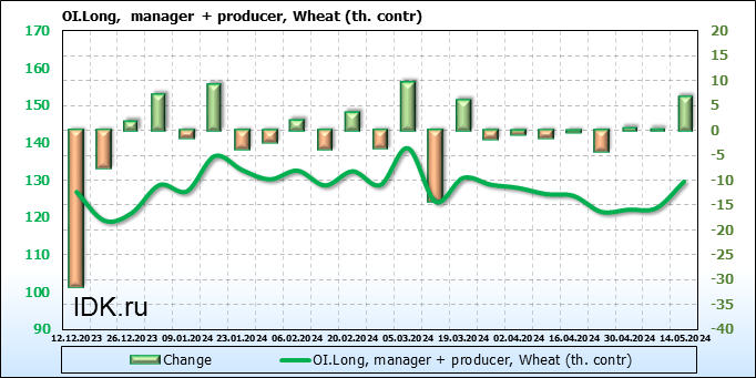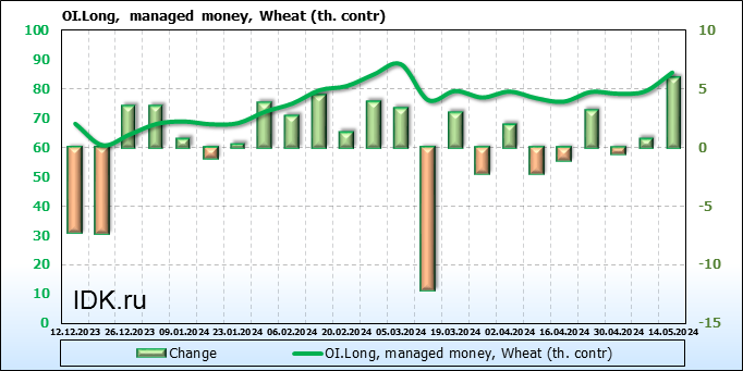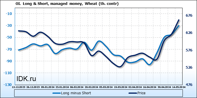 За прошедшую неделю, 08.05.24 — 14.05.24, разница между длинными и короткими позициями управляющих сократилась на 14.6 тыс. контрактов. В тоже время, цена выросла на 41 цент.