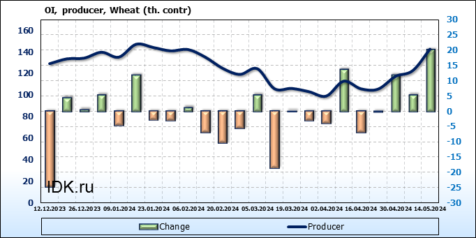 Открытый интерес производителей вырос на 20 тыс. контрактов. Объем контрактов, направленных на хеджирование, составляет 142 380 штук. Деньги производителей в течение прошлой недели приходили на рынок поддерживая тенденцию.