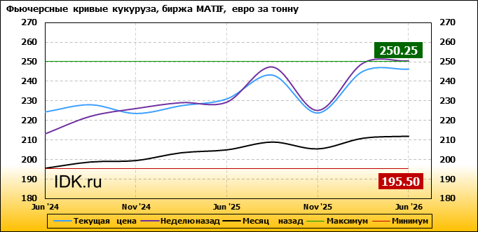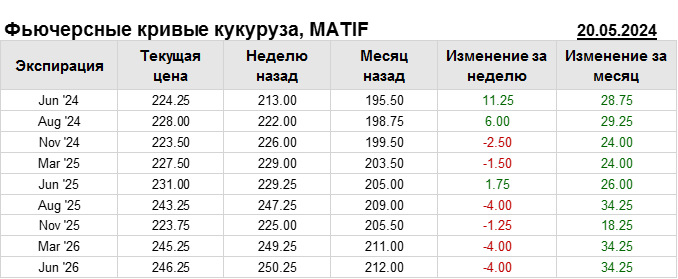 На 20.05.2024 стоимость кукурузы на бирже MATIF по контракту Jun ’24 составила 224.25 евро за тонну. За прошедшую неделю стоимость кукурузы на европейской площадке выросла на 11.25 евро/тонна. Как мы видим на графике, фьючерсная кривая имеет периоды, когда более дальний фьючерс дешевле ближнего. Состояние бэквардации наблюдаем на следующих контрактах: Nov ’24; Nov ’25. Таким образом, трейдеры предполагают, что возможно превалирование предложения над спросом в указанные периоды.