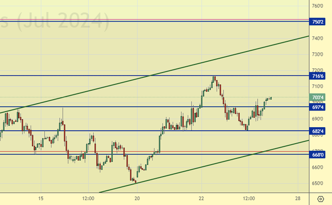 Снова мы выше 700.0, и в целом не будет ничего дурного в достижении 750.0, а вот если мы туда не пойдем, вот тогда это может привести к жуткому расстройству психики покупателей, что способно спровоцировать сброс куда-то к 500.0.