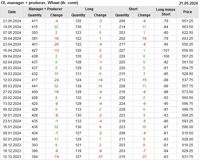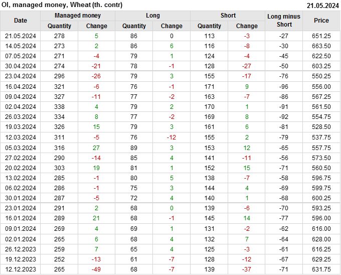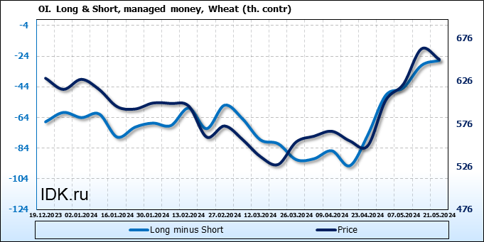 За прошедшую неделю, 15.05.24 — 21.05.24, разница между длинными и короткими позициями управляющих сократилась на 3.3 тыс. контрактов. В тоже время, цена упала на 12.25 цента.