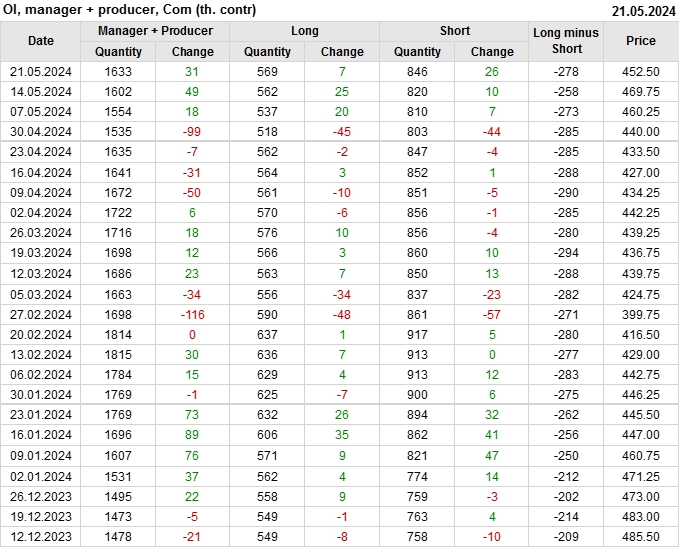 За прошлую неделю, 15.05.24 — 21.05.24, разница между длинными и короткими позициями управляющих увеличилась на 54.4 тыс. контрактов. В тоже время, цена упала на 17.25 цента.