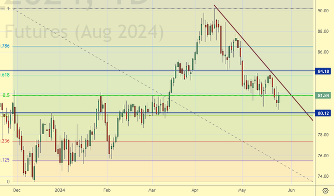 Продажа: нет. Кто в позиции от 87.50 (с учетом перехода на новый контракт), перенесите стоп на 84.30. Цель: 77.80.