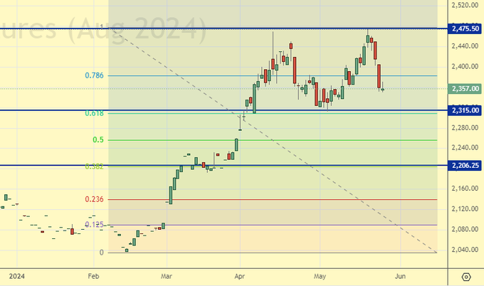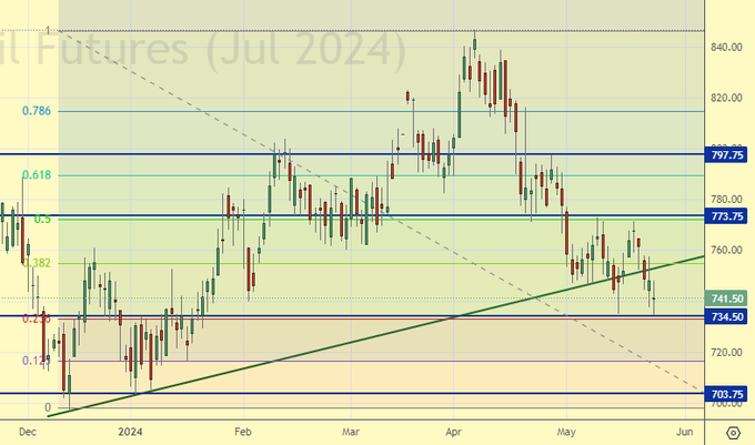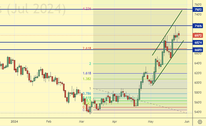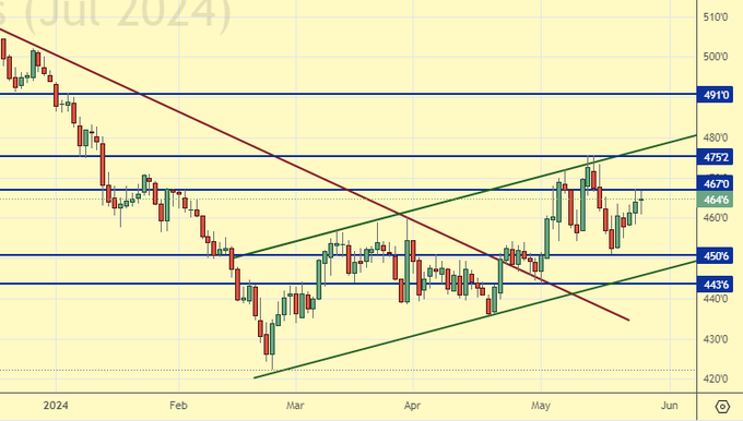 Сценарий роста: рассматриваем июльский фьючерс, дата экспирации 12 июля. Пока держим лонг. Сои обещают много, но рынок упорно смотрит вверх.