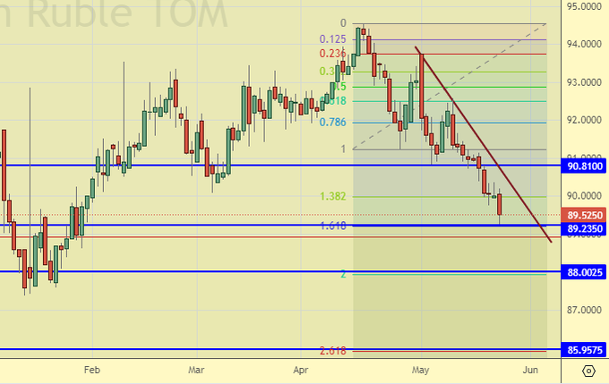 Скорее всего, в июне увидим повышение ставки на 1% до 17%. Эти ожидания, а также падение спроса на валюту из-за падения импорта, дают паре возможность припасть к 89.00, что, по сути, уже произошло, а также мы можем рассчитывать на ход и к 86.00.