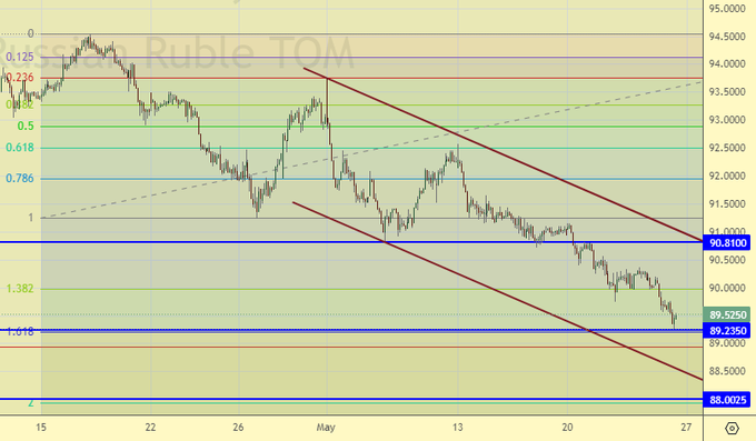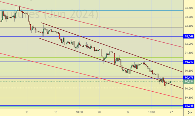 Ушли ниже 90.00, что привело к ходу на 89.30. Ниже у нас только уровень 86.00. Пойдем ли мы к нему пока вопрос, но стоит отметить отсутствие сильных покупок доллара, которые бы смогли как-то повлиять на курс. То есть идут некие маневры, если кто-то и будет покупать пару, то будет это делать ниже текущих отметок.