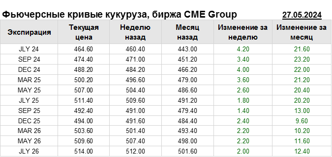 На 27.05.2024 стоимость кукурузы на бирже CME Group по контракту JLY 24 составила 464.6 цента за бушель. За прошедшую неделю стоимость кукурузы на площадке CME Group выросла на 4.2 цента/бушель. Как мы видим на графике, фьючерсная кривая имеет периоды, когда более дальний фьючерс дешевле ближнего. Состояние бэквардации наблюдаем на следующих контрактах: SEP 25. Таким образом, трейдеры предполагают, что возможно превалирование предложения над спросом в указанные периоды.