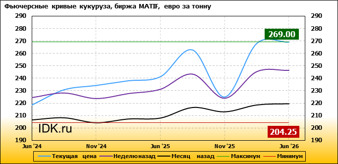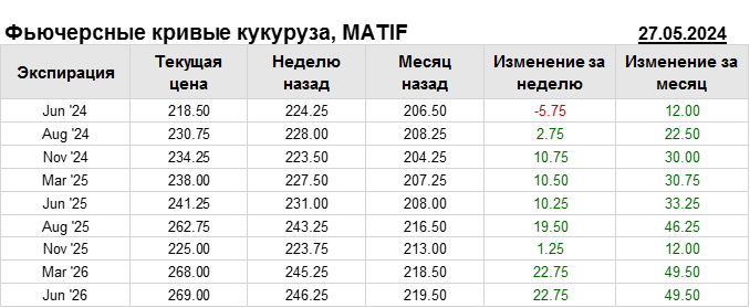 На 27.05.2024 стоимость кукурузы на бирже MATIF по контракту Jun ’24 составила 218.5 евро за тонну. За прошедшую неделю стоимость кукурузы на европейской площадке упала на 5.75 евро/тонна. Как мы видим на графике, фьючерсная кривая имеет периоды, когда более дальний фьючерс дешевле ближнего. Состояние бэквардации наблюдаем на следующих контрактах: Nov ’25. Таким образом, трейдеры предполагают, что возможно превалирование предложения над спросом в указанные периоды.