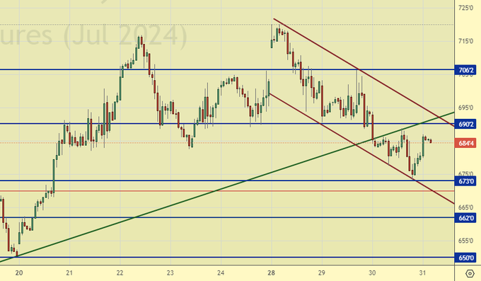 Если быкам снова удастся затолкать рынок выше 700.0 можно будет подумать о покупках. А от 750.0 продавать будем обязательно.