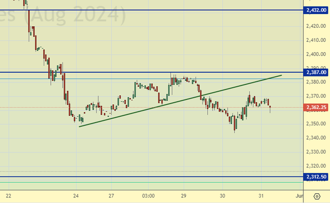 12 июня заседание ФРС. До него еще далеко, но так как идей никаких нет и не будет, и вообще, лето, то скорее всего мы останемся в районе 2350, до этой даты, а затем, вероятнее всего, продолжим падать.