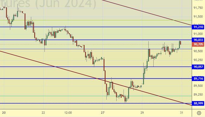 Продажа: нет. Кто в позиции от 90450, держите стоп на 90900. Цель: 87000.