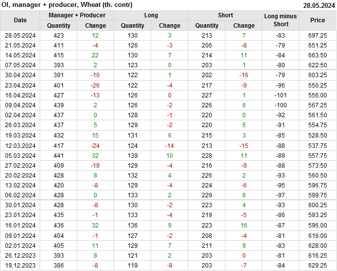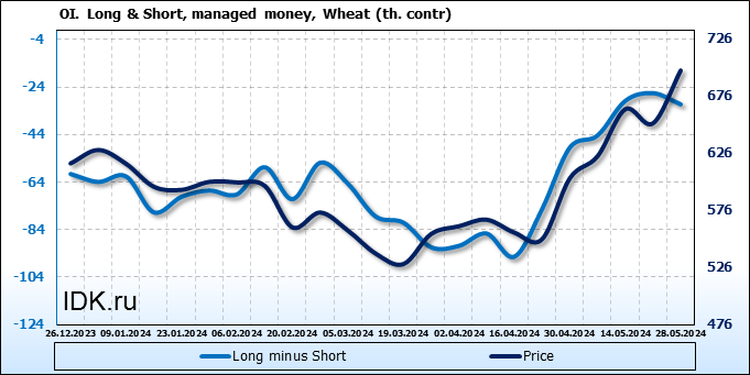 За прошедшую неделю, 22.05.24 — 28.05.24, разница между длинными и короткими позициями управляющих увеличилась на 4.7 тыс. контрактов. В тоже время, цена выросла на 46 центов.