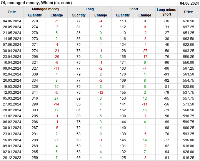 За прошедшую неделю, 29.05.24 — 04.06.24, разница между длинными и короткими позициями управляющих увеличилась на 4.8 тыс. контрактов. В тоже время, цена упала на 18.75 цента.