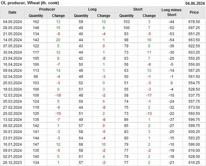 Открытый интерес производителей вырос на 13 тыс. контрактов. Объем контрактов, направленных на хеджирование, составляет 162 048 штук. Деньги производителей в течение прошлой недели приходили на рынок поддерживая тенденцию.