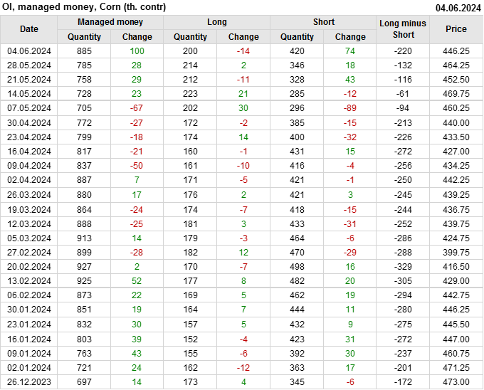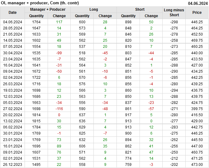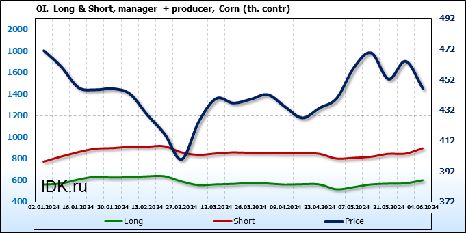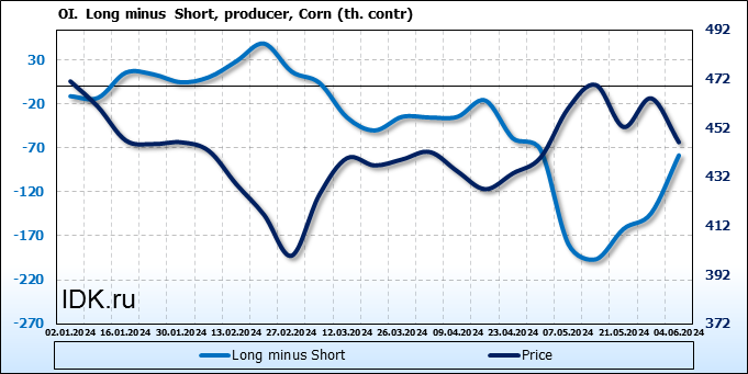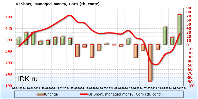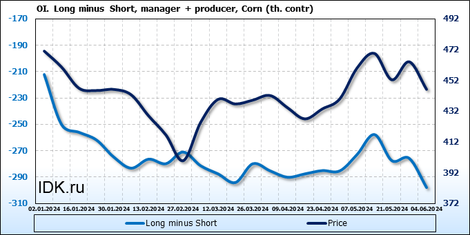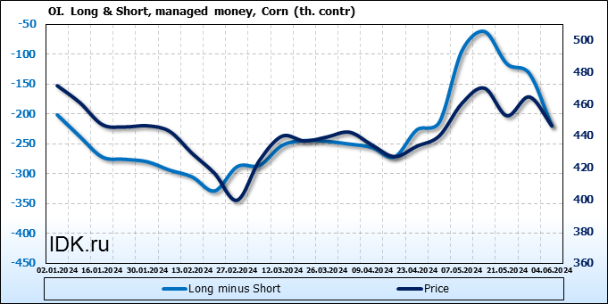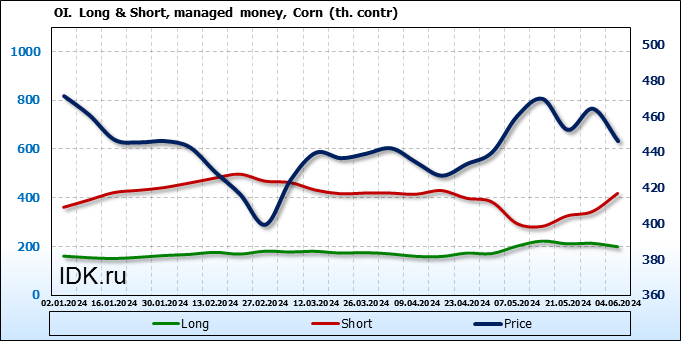 За прошлую неделю, 29.05.24 — 04.06.24, разница между длинными и короткими позициями управляющих увеличилась на 87.8 тыс. контрактов. В тоже время, цена упала на 18 центов.