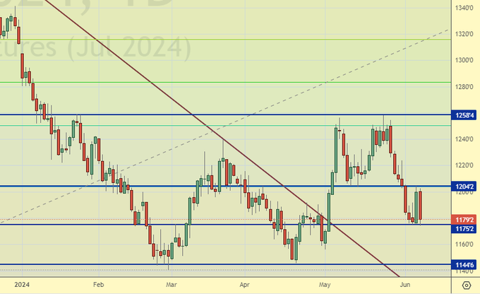 Сценарий роста: перешли на сентябрьский фьючерс, дата экспирации 19 сентября. В рост в долларах российского рынка не верим. Не покупаем.