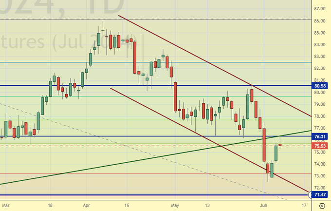 Сценарий роста: рассматриваем июльский фьючерс, дата экспирации 20 июня. Теперь покупки имеют смысл после роста выше 80.00.