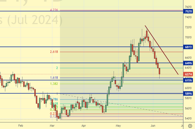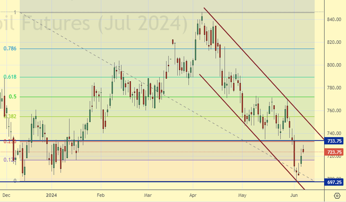 Пшеница упала на фоне докладов об отличном урожае в Индии, что означает снижение закупок данной страной пшеницы на внешнем рынке. На следующей неделе ждем прогноз от американского Минсельхоза, который скорее всего будет не менее оптимистичным чем майский, что приведет или к падению цен, или к тому, что они останутся на текущих уровнях. В теории, возможен краткосрочный ценовой всплеск по пшенице до 750 центов за бушель. Предположить еще более высокие цены в Чикаго сейчас невозможно.