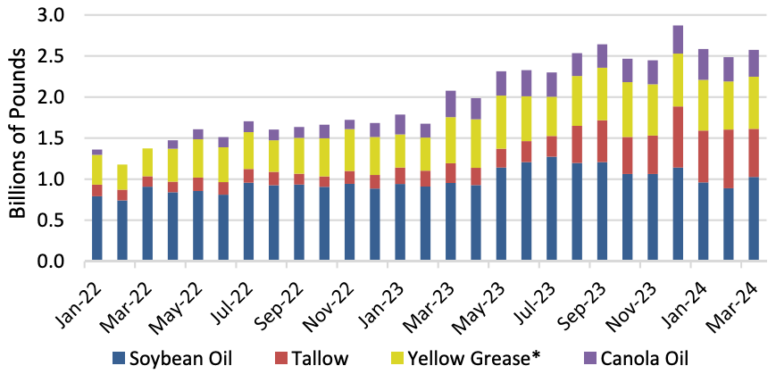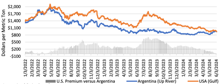 Премиальное соевое масло в США по сравнению с аргентинским соевым маслом достигло пика летом 2023 года, когда увеличилось производство возобновляемого дизельного топлива. С тех пор доля соевого масла, используемого в биотопливе, снизилась отчасти из-за более широкого использования другого сырья, такого как жир, желтый жир и отработанное кулинарное масло, которые стимулируются политикой Калифорнии. Для сравнения, доля соевого масла снизилась с почти 45 процентов потребления сырья в начале 2022 года до менее 35 процентов в начале 2024 года.