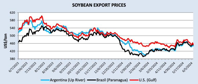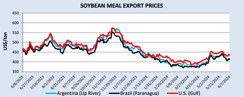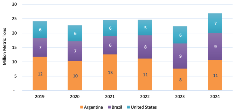Урожай сои 2024 года в Южной Америке подходит к концу, а цены на соевый комплекс продолжают находиться под давлением. Мировые поставки больше по сравнению с прошлым годом, когда производство сои в Аргентине сократилось из-за засухи. Поскольку экспортные цены на соевый шрот снизились по сравнению с предыдущим годом, мировой спрос на протеиновый шрот увеличился и увеличил экспорт.
