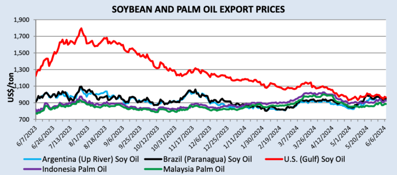 Премия к цене на соевое масло в США по сравнению с другими крупными экспортерами снизилась, и ожидается, что в 2024/25 году Соединенные Штаты станут чистым экспортером соевого масла. Ценовая премия за последние пару лет была обусловлена более высоким внутренним спросом на соевое масло при производстве биотоплива, особенно в связи с увеличением производства возобновляемого дизельного топлива, направляемого на рынок Калифорнии.