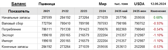 За прошедший месяц министерство сельского хозяйства США (USDA) на 12.06.2024 пересмотрело Баланс пшеницы для Мира в сезоне 24/25 следующим образом: