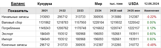 За прошедший месяц министерство сельского хозяйства США (USDA) на 12.06.2024 пересмотрело Баланс кукурузы для Мира в сезоне 24/25 следующим образом: