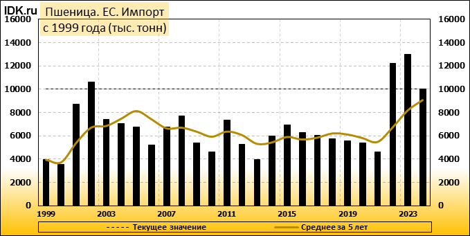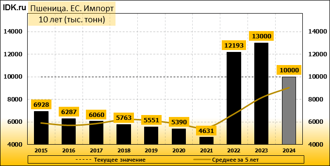 Импорт: составит 10000 тысяч тонн. Значение по прошествии месяца упало на -9.09 процента.