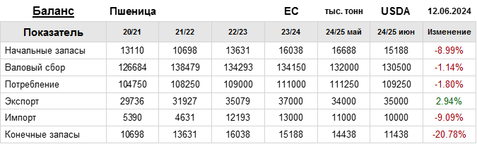 За прошедший месяц министерство сельского хозяйства США (USDA) на 12.06.2024 пересмотрело Баланс пшеницы для ЕС в сезоне 24/25 следующим образом: