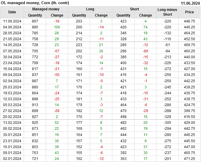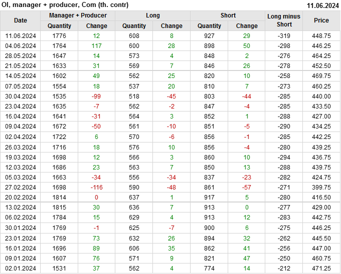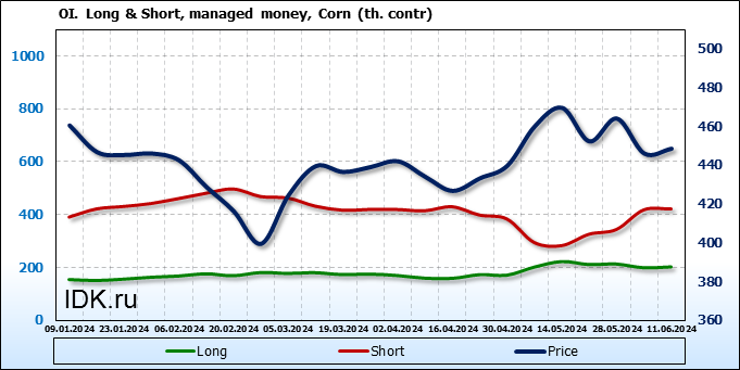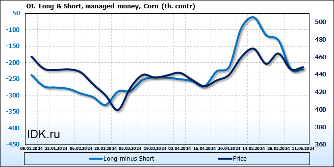 За прошлую неделю, 05.06.24 — 11.06.24, разница между длинными и короткими позициями управляющих увеличилась на 0.4 тыс. контрактов. В тоже время, цена выросла на 2.5 цента.