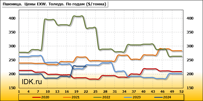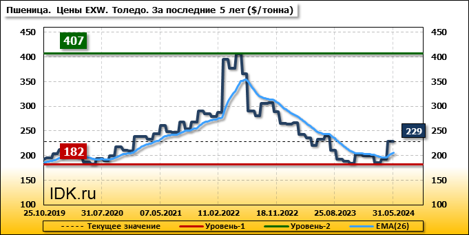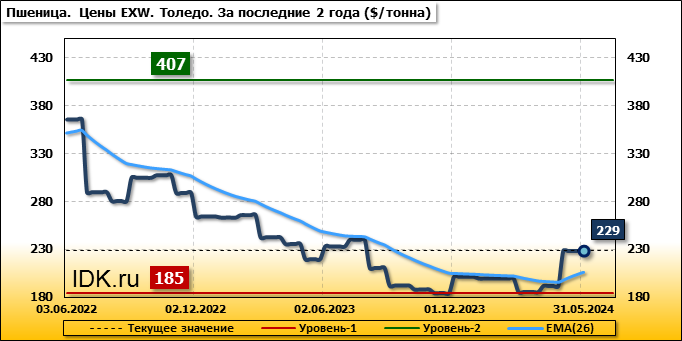 Внутренние цены на пшеницу SRW в городе Толедо (США) выросли на 36.4 $/т. и на отчетный месяц составляют 228.53 доллара за тонну.