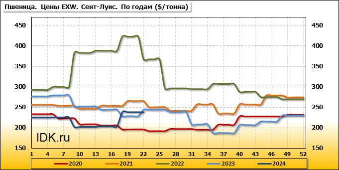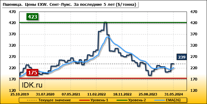 За прошедший месяц внутренние цены на пшеницу SRW в Сент-Луисе (США) выросли на 34.2 $/т. и на отчетный месяц составляют 238.83 доллара за тонну.