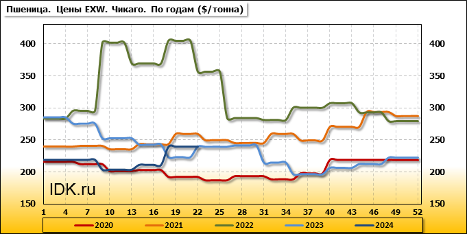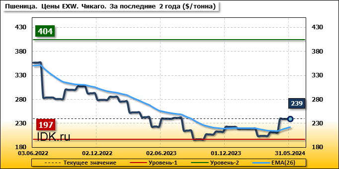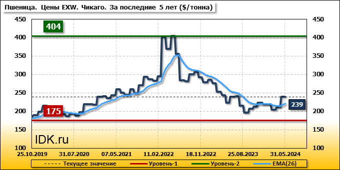 В Чикаго (США) внутренние цены на пшеницу SRW выросли на 28 $/т. и на отчетный месяц составляют 239.2 доллара за тонну.