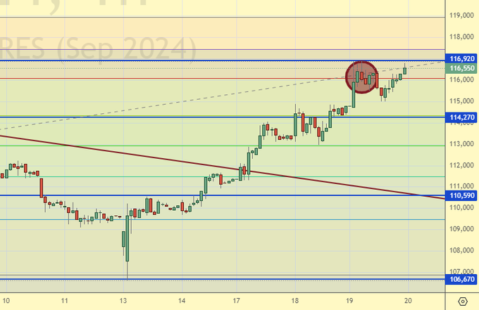 Продажа: нет. Кто в позиции от 115000 и 116000, перенесите стоп на 117300. Цель 100000.