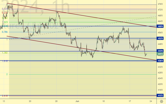 Вот-вот. Идет падение цен. Если мы уйдем ниже 430.0, то это может привести к неоднократно анонсированному ходу на 370.0. Пока никаких сделок на данном рынке не совершаем.