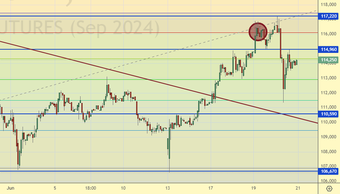 Продажа: нет. Кто в позиции от 115000 и 116000, перенесите стоп на 117000. Цель 100000.