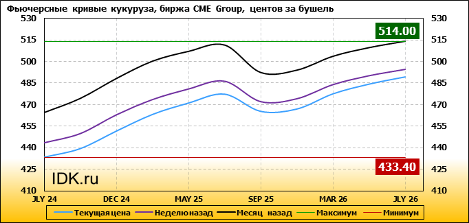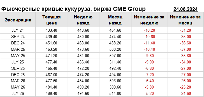 На 24.06.2024 стоимость кукурузы на бирже CME Group по контракту JLY 24 составила 433.4 цента за бушель. За прошедшую неделю стоимость кукурузы на площадке CME Group упала на 10.2 цента/бушель. Как мы видим на графике, фьючерсная кривая имеет периоды, когда более дальний фьючерс дешевле ближнего. Состояние бэквардации наблюдаем на следующих контрактах: SEP 25. Таким образом, трейдеры предполагают, что возможно превалирование предложения над спросом в указанные периоды.