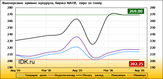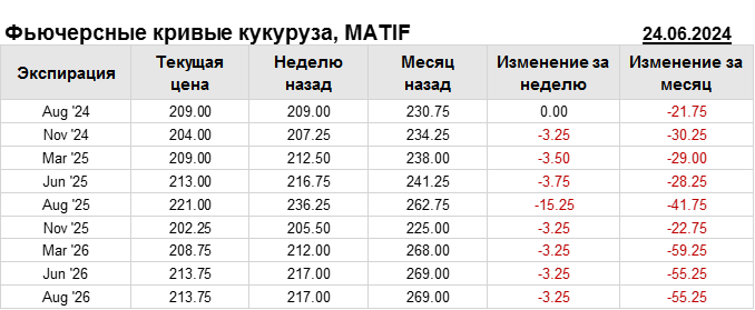На 24.06.2024 стоимость кукурузы на бирже MATIF по контракту Aug ’24 составила 209 евро за тонну. За прошедшую неделю стоимость кукурузы на европейской площадке не изменилась. Как мы видим на графике, фьючерсная кривая имеет периоды, когда более дальний фьючерс дешевле ближнего. Состояние бэквардации наблюдаем на следующих контрактах: Nov ’24; Nov ’25. Таким образом, трейдеры предполагают, что возможно превалирование предложения над спросом в указанные периоды.