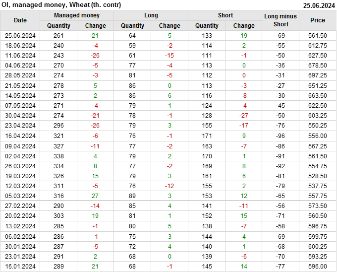 За прошедшую неделю, 19.06.24 — 25.06.24, разница между длинными и короткими позициями управляющих увеличилась на 14.3 тыс. контрактов. В тоже время, цена упала на 51.25 цента.