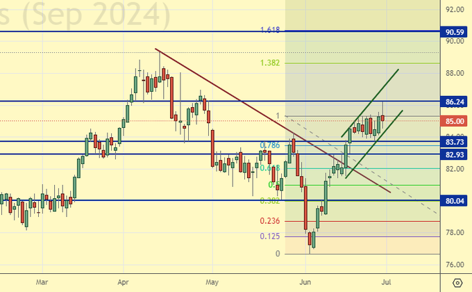Brent держится в районе 85.00 и не желает откатывать к 80.00. Нефть растет даже на фоне роста запасов в США. Трейдеры видят, что спрос продолжит оставаться высоким. Не исключено, что только осенью, когда придут результаты за третий квартал в США по ВВП, и когда станет ясно, что высокая ставка все-таки придушила экономическую активность, мы увидим откат.