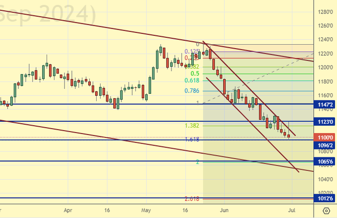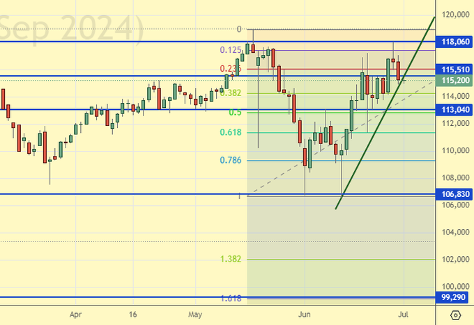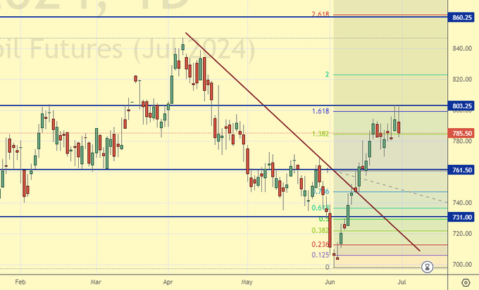 Сценарий роста: рассматриваем июльский фьючерс, дата экспирации 31 июля. Мы куда-то активно пошли, но в пятницу закрепиться выше закрытия четверга не получилось. Вне рынка.