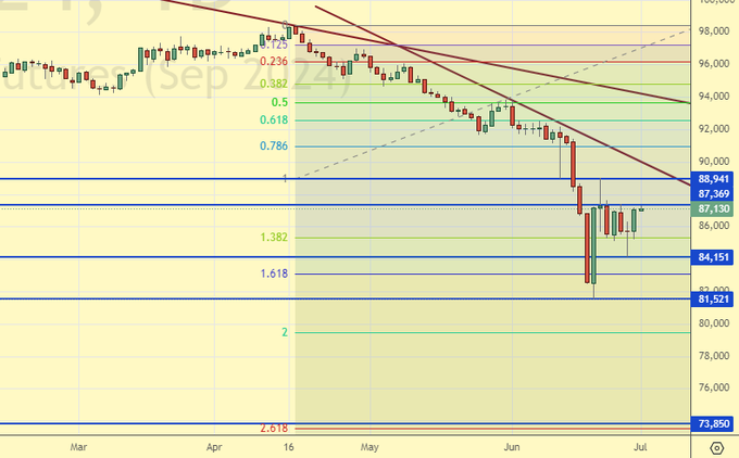 Сценарий роста: рассматриваем сентябрьский фьючерс, дата экспирации 19 сентября. Уровень 89000 ключевой. Пока мы ниже него, не покупаем. Однако, от 74000 покупаем обязательно.
