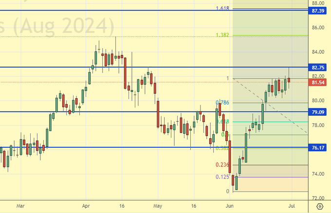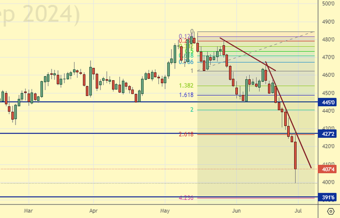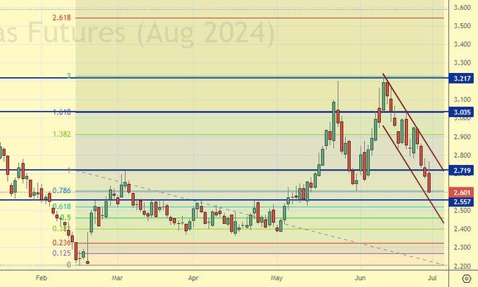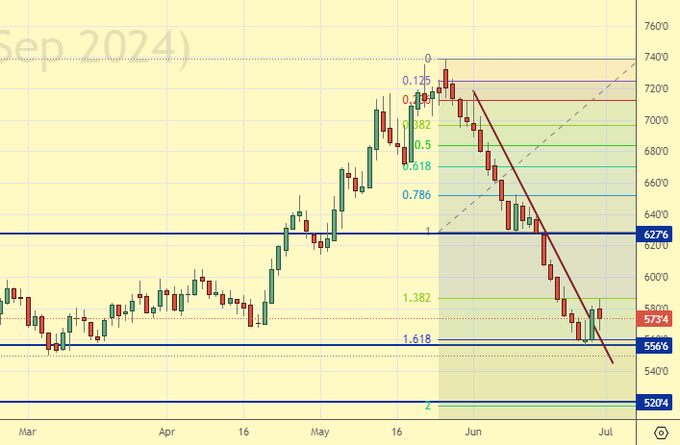 Пшеница, в отличии от кукурузы, отпадала чуть ранее и сейчас остановилась над 560.0 центов за бушель. По данной культуре ждут некоторого, но не критичного, сокращения предложения в сезоне 24/25, поэтому можем увидеть коррекцию вверх. Возможно, если экономическая ситуация в мире ухудшится, а такое может быть, например, этой осенью, то это приведет к сокращению потребления как хлеба, так и мяса, что создаст на рынке еще больший профицит зерна и не видать нам 700.0 центов за бушель в ближайшие месяцы.