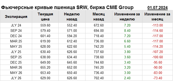 На 01.07.2024 стоимость пшеницы SRW на бирже CME Group по контракту JLY 24 составила 559.6 цента за бушель. За прошедшую неделю стоимость пшеницы SRW выросла на 7.2 цента/бушель. Как мы видим на графике, фьючерсная кривая имеет периоды, когда более дальний фьючерс дешевле ближнего. Состояние бэквардации наблюдаем на следующих контрактах: MAY 26; JLY 26. Таким образом, трейдеры предполагают, что возможно превалирование предложения над спросом в указанные периоды.