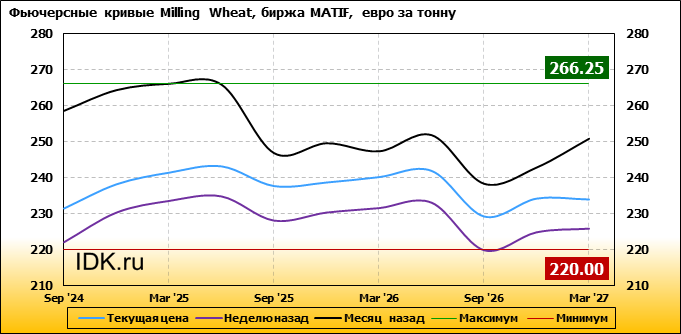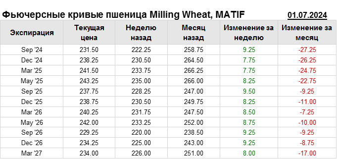 На 01.07.2024 стоимость пшеницы Milling Wheat на бирже MATIF по контракту Sep ’24 составила 231.5 евро за тонну. За прошедшую неделю стоимость пшеницы Milling Wheat выросла на 9.25 евро/тонна. Как мы видим на графике, фьючерсная кривая имеет периоды, когда более дальний фьючерс дешевле ближнего. Состояние бэквардации наблюдаем на следующих контрактах: Sep ’25; Sep ’26; Mar ’27. Таким образом, трейдеры предполагают, что возможно превалирование предложения над спросом в указанные периоды.