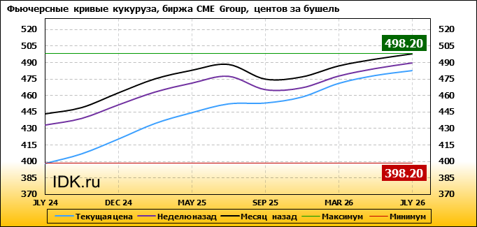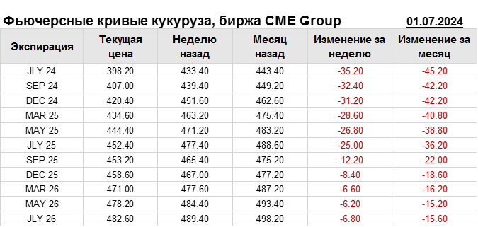 На 01.07.2024 стоимость кукурузы на бирже CME Group по контракту JLY 24 составила 398.2 цента за бушель. За прошедшую неделю стоимость кукурузы на площадке CME Group упала на 35.2 цента/бушель.