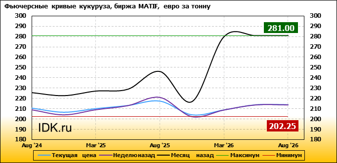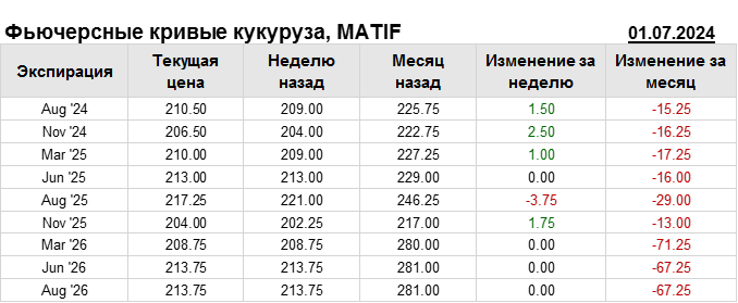 На 01.07.2024 стоимость кукурузы на бирже MATIF по контракту Aug ’24 составила 210.5 евро за тонну. За прошедшую неделю стоимость кукурузы на европейской площадке выросла на 1.5 евро/тонна. Как мы видим на графике, фьючерсная кривая имеет периоды, когда более дальний фьючерс дешевле ближнего. Состояние бэквардации наблюдаем на следующих контрактах: Nov ’24; Nov ’25. Таким образом, трейдеры предполагают, что возможно превалирование предложения над спросом в указанные периоды.