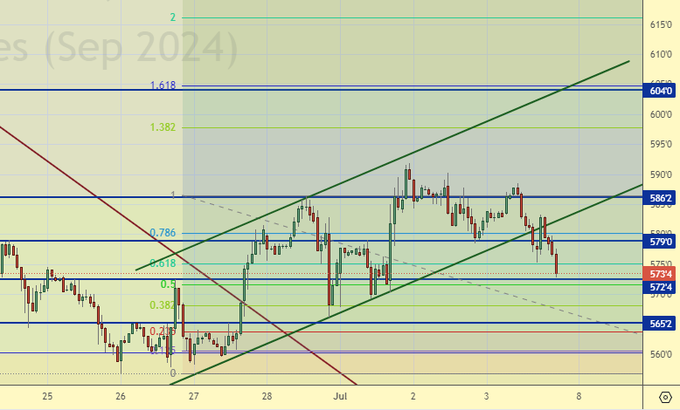Видим, что рынок не хочет рисовать нам нормальный коррекционный ход после падения. После вчерашнего дня остался у нас как поддержка уровень 570.0, падение ниже которого вызовет у покупателей расстройство психики и срывы стоп-ордеров, конечно.