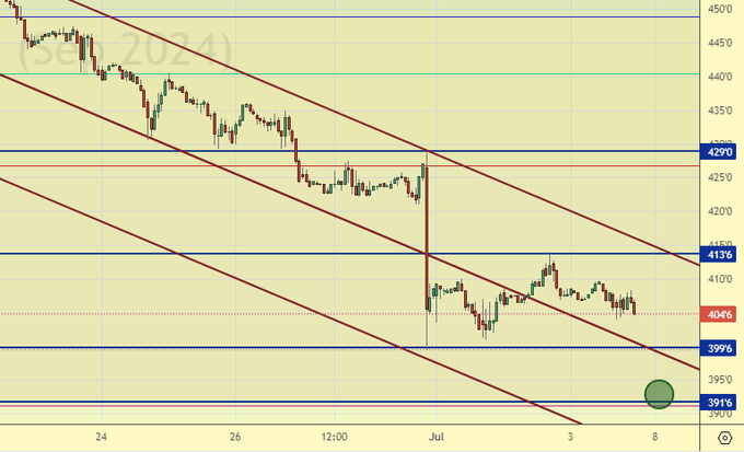 Всё выглядит так, что сегодня мы пройдем к 393.0. Там надо будет купить. При этом отметим, что шансы на дальнейшее падение есть, но какую-то коррекцию вверх после хода в район 393.0 мы увидеть должны.